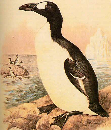 Oiseau marin des côtes rocheuses de l'Atlantique Nord disparu au milieu du XIXème siècle pour avoir été trop chassé par les marins pour sa chair et ses plumes.